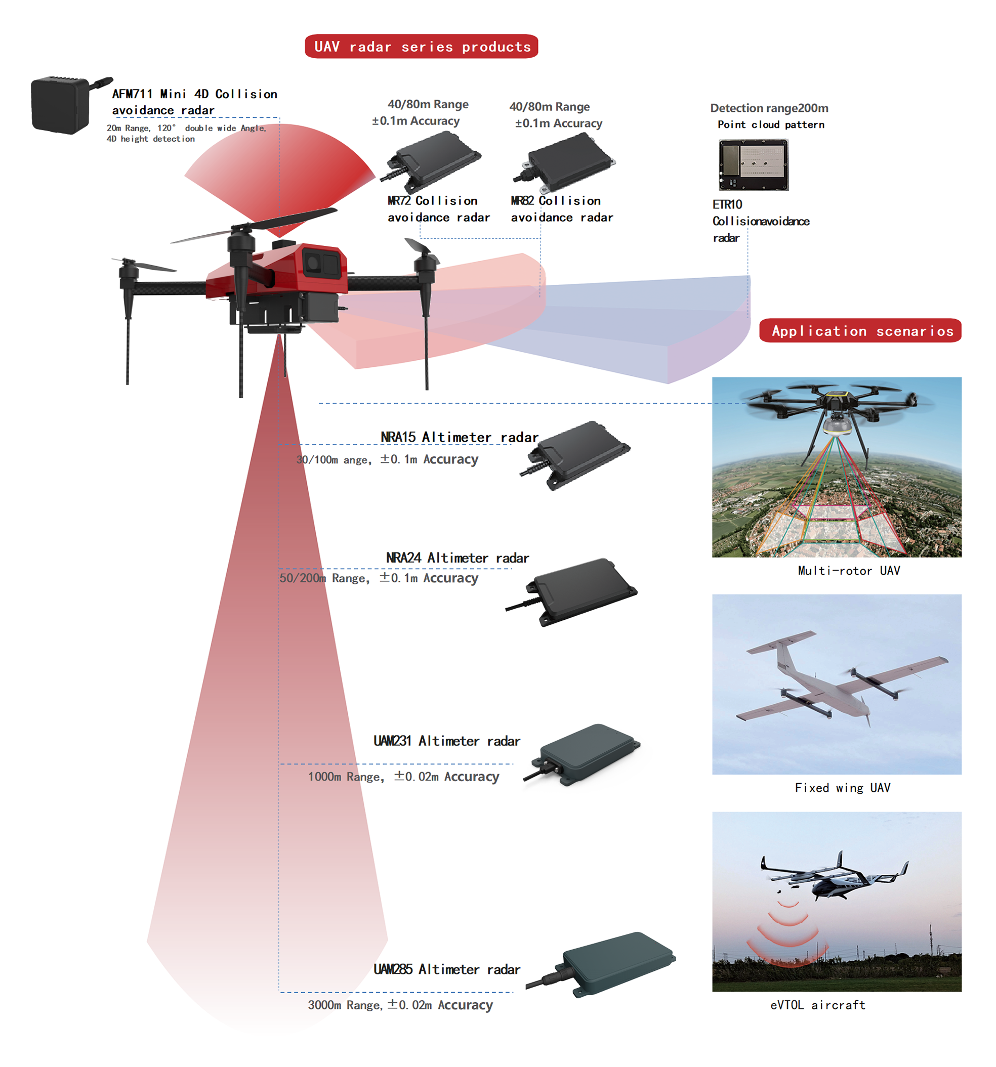 For the drone industry, Nanoradar has developed 8 altitude-holding and obstacle avoidance radar products, featuring high refresh rates of 50-500Hz and detection ranges covering 30 meters to over 3000 meters. The radars are installed below the drone to measure flight altitude, while front, rear, left, and right radars detect obstacles during flight. A top-mounted radar ensures the drone avoids obstacles like high-voltage power lines above. Together, these 8 radars provide 720° omni-directional立体 protection for drones!